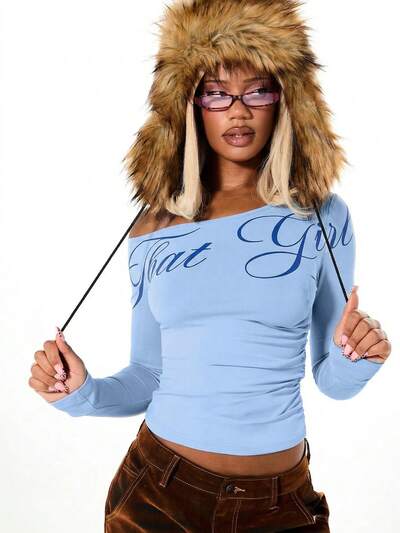 SUMWON WOMEN Off Shoulder Long Sleeve Ruched Side Top With Script Print For Women Fall Winter