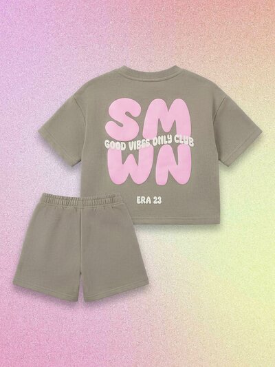 Cute Girls Summer Co-Ord Set With Bubble Letter Print Short Sleeve Tee And Matching ShortsNEW