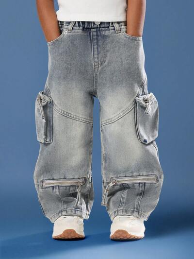 Wide Leg Cargo Jeans With Zippered Pockets And Adjustable SidesNEW