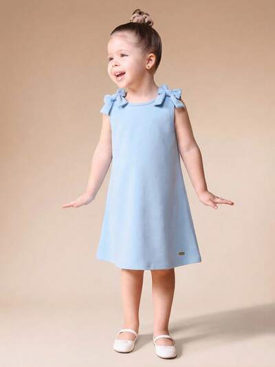 Girls Light Blue A-Line Dress With Bow Shoulder Details And Keyhole Back Opening Mini Length Sleeveless Summer Casual DressCrew Neck T-Shirt With Embossed Logo