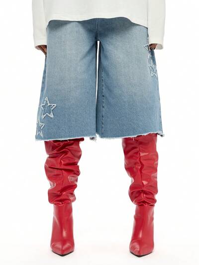 SUMWON WOMEN Star Applique High Rise Distressed Raw Hem Denim Shorts-50%
