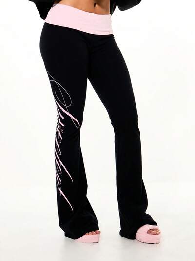 BABYPHAT Pull On Flare Leggings With Script Print High Waisted Wide Leg Pants For Casual Streetwear