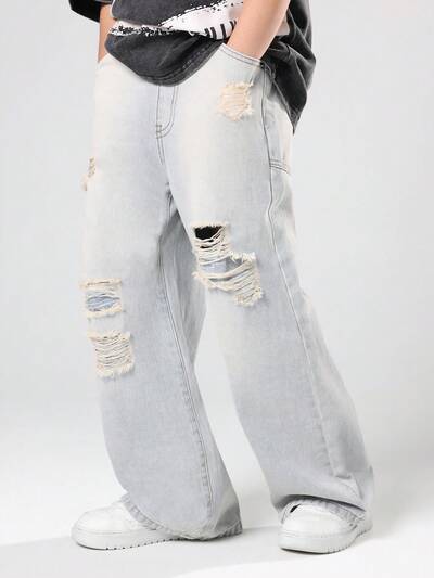 Wide Leg Distressed Denim Jeans With Ripped DetailsNEW