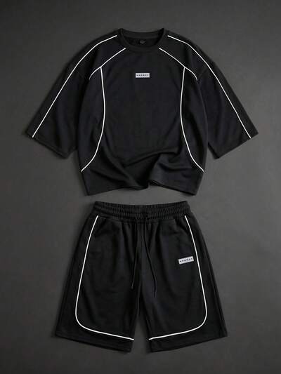 Black Long Sleeve Oversized Top And Shorts Co-Ord Set With White Contrast Piping Detail Crew Neck Casual Streetwear Two Piece OutfitNEW