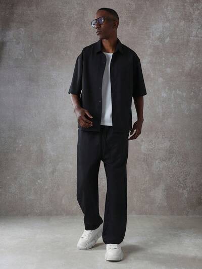 Oversized Button Down Short Sleeve Shirt And Wide Leg Pants Set-25%