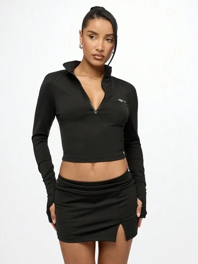 SUMWON WOMEN High Performance Half-Zip Crop Athletic Top With Thumb Holes
