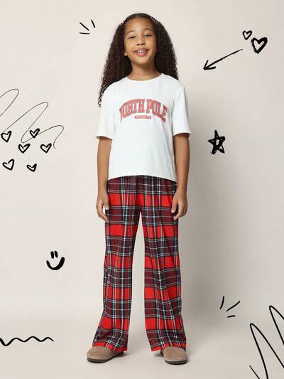Tween Girls Comfy Christmas Regular Fit Graphic Printed Tee And Check Pant 2 Piece Pyjama Set-30%