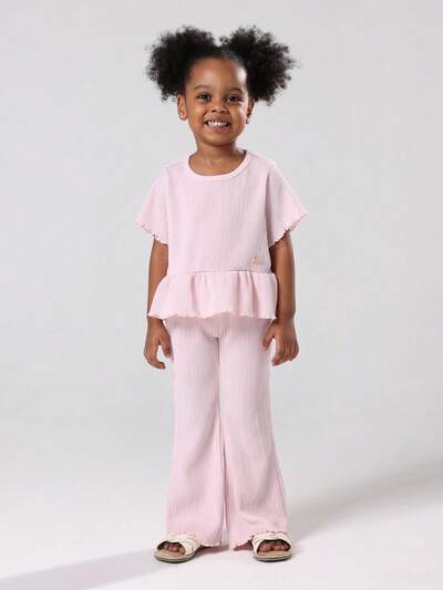 Girls Ruffle Sleeve Crew Neck Mini Dress With Double Layer Sleeve Detail And Embroidered LogoOversized T-Shirt And Pants Set With Text Print