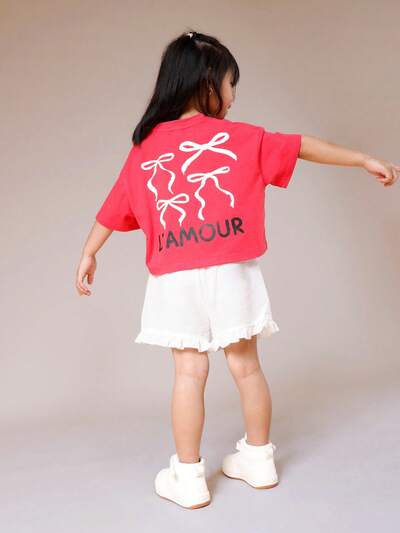Girls Cropped T-Shirt And Shorts Co-Ord Set With Heart Print Summer CasualwearScript Print T-Shirt And Wide Leg Pants Set