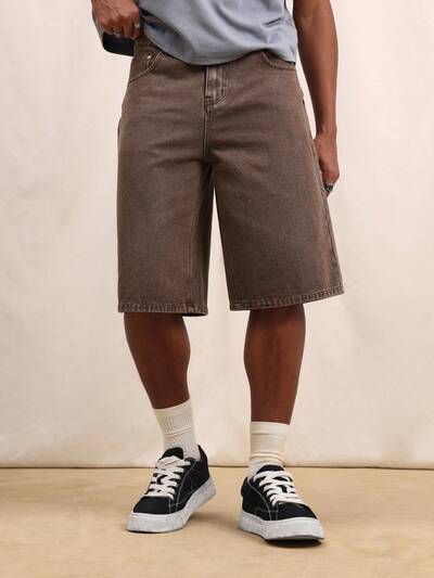 Baggy Wide Leg Long Sparkle Embellished Denim ShortsMen's Relaxed Fit Brown Denim Jorts Knee Length Bermuda Style Casual Summer Shorts With Pockets Classic Vintage Wash