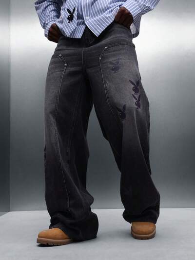 PLAYBOY X SUMWON Men's Relaxed Baggy Logo Denim Jeans Wide Leg Casual Streetwear Medium Wash Blue PantsWashed Denim Hooded Bomber Jacket With Cargo Pockets