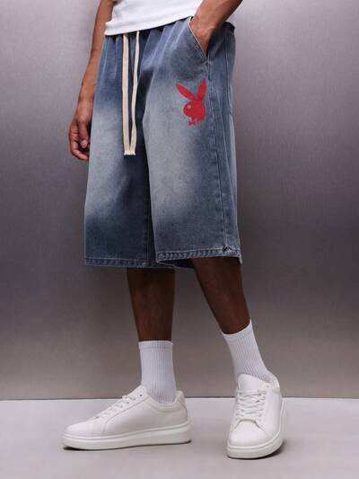 PLAYBOY X SUMWON Vintage Washed Denim Jorts With Logo Drawstring Waist Knee Length Baggy Wide Leg Summer Casual Street Style Pull On Shorts-50%