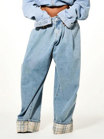 SUMWON WOMEN Slouchy Barrel Jeans With Check HemSUMWON WOMEN Baggy Button-Front Denim Shorts With Chain Details