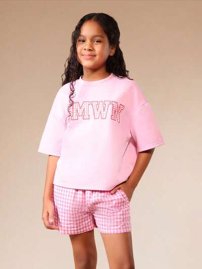 Pink Crew Neck Short Sleeve T-Shirt With Gingham Shorts Co-Ord Set Spring Summer Casual Tween Outfit With Text Print-10%