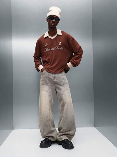 PLAYBOY X SUMWON Men Long Sleeve Boxy Fit Football Style Polo Shirt With White Collar And Logo Embroidery Casual Weekend WearNEW
