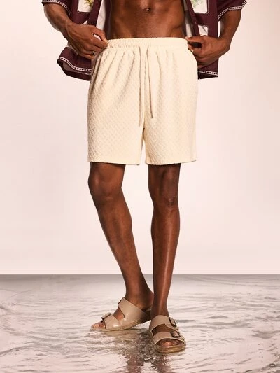 Regular Fit Towelling Texture Summer Casual Drawstring Beige Shorts With Side Pockets And Embroidered Logo Detail