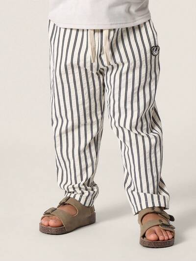 Boys Linen Feel Striped Wide Leg Pants Wobbly Vertical Stripes Light Blue White Casual Summer Breathable Loose Fit TrousersStriped Pull On Shorts With Drawstring