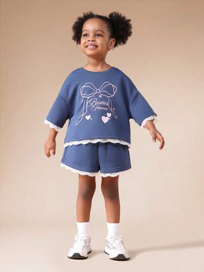 Lace Trim Sweatshirt And Shorts Set With Bow Print
