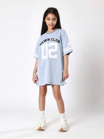 Lace Panel T-Shirt Dress With Varsity Number PrintOversized Graphic Tee With Letter Print