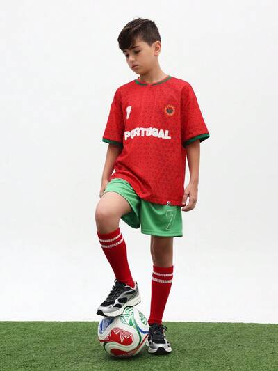 Boys Portugal Team Inspired Red Short Sleeve Jersey Tee With Green Athletic Shorts Matching Soccer Set With Number 7Oversized Tee With Camo Shorts Set