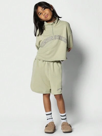 Tween Girls Overhead Crop Half Zip Hoodie With Cargo Pocket And Cargo Jort With Small Graphic Print Detail 2 Piece Set-50%