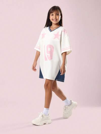 Oversized T-Shirt Dress With Varsity Number Print And Stars-45%