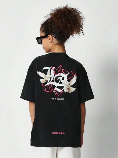 Tween Girls Washed Oversized Fit Drop Shoulder Tee With Graphic Print-50%