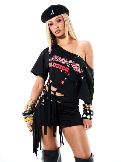 SUMWON WOMEN Black Off Shoulder Graphic Print Cut Out Fringe Mini Dress With Star Details And Lace Up Design For Women Party Casual Club Night OutNEW