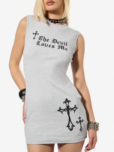SUMWON WOMEN Ribbed Bodycon Mini Dress With Gothic Cross PrintBABYPHAT Long Sleeve Notch Neck Bodycon Mini Dress With Rhinestone Text Detail For Party Occasions