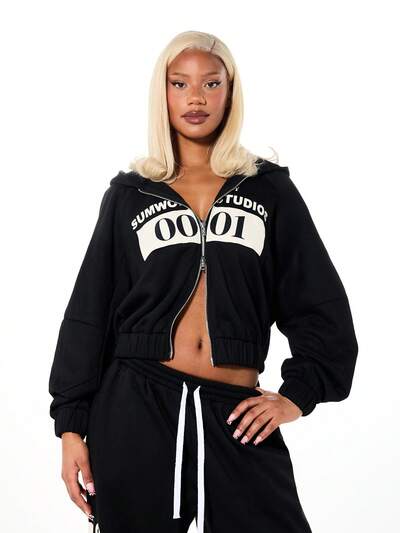 SUMWON WOMEN Oversized Cropped Hoodie With Graphic Text PrintBABYPHAT Women Navy Velour Full Zip Hoodie With Drawstring Hood Short Sleeve Cropped Sweatshirt Script Print Top