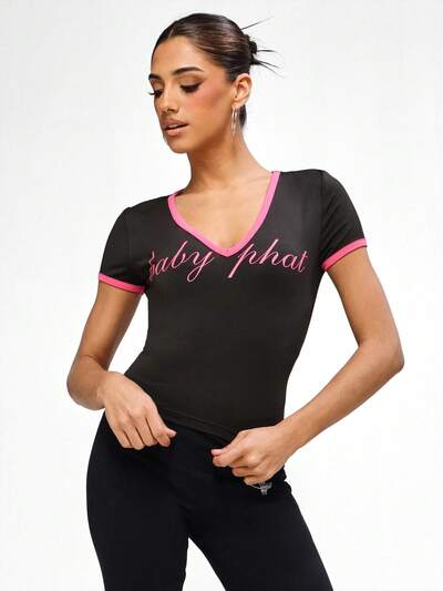 BABYPHAT V-Neck Baby Tee With Pink Contrast Binding And Cursive Script Text Short Sleeve Fitted Top