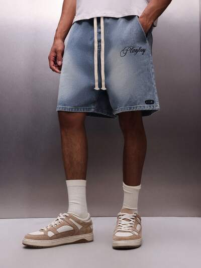PLAYBOY X SUMWON Men's Vintage Washed Denim Pull On Shorts With Drawstring Waistband Text Print Casual Summer Bermuda StyleNEW