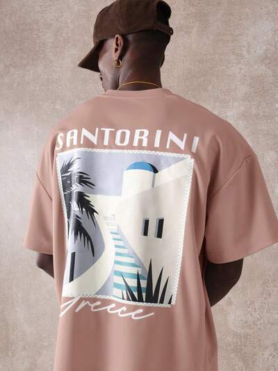 Boxy Fit Men's Oversized Graphic T-Shirt With Santorini Greece Print Mediterranean Summer Vacation Tee Casual StreetwearNEW