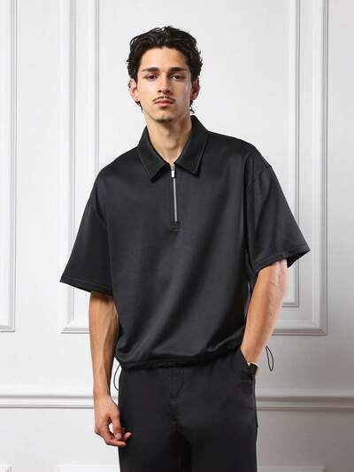 SUMWON Boxy Fit Quarter Zip Polo Shirt Adjustable Drawstring Hem Short Sleeve Collar Casual Streetwear Modern Fashion Style Plain-35%