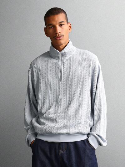 Essential Quarter Zip Funnel Neck Textured Sweatshirt With Ribbed Pattern-40%