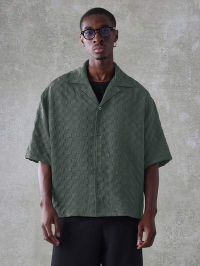 Oversized Textured Camp Collar Button Down Short Sleeve Shirt-10%