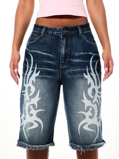SUMWON WOMEN Jeansshorts mit Print und ausgefranstem Saum