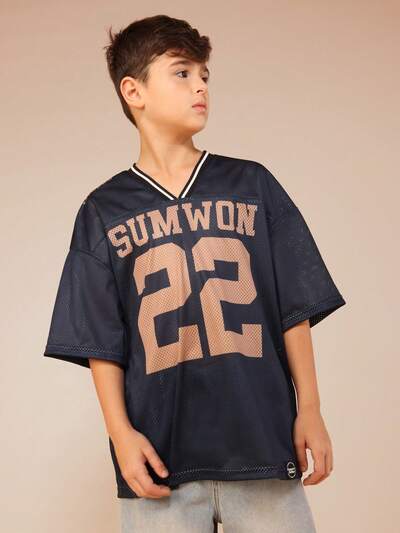 Mesh-Einsatz-T-Shirt mit V-Ausschnitt und Nummernaufdruck