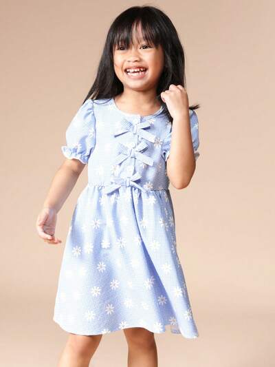 Kurzärmeliges Gingham-Kleid mit Schleife vorne