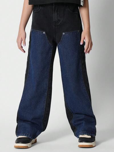 Carpenter Detail Farbe Blockiert Jeans für Tween Mädchen mit lockerer Passform-50%