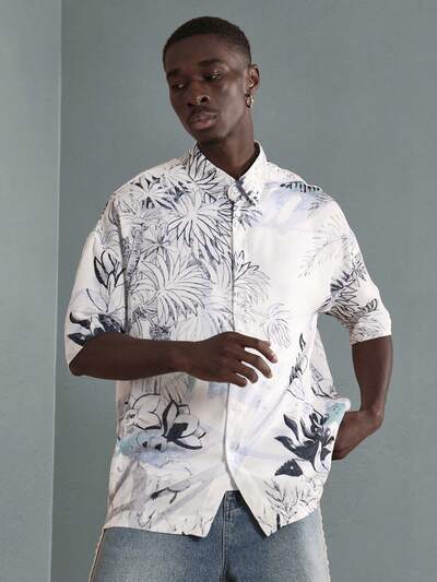 Langärmliges Button-Down-Hemd mit tropischem Palmendruck-35%