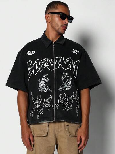Boxiger Passform Reißverschluss-Kragen Brklyn Grafikdruck Hemd-50%