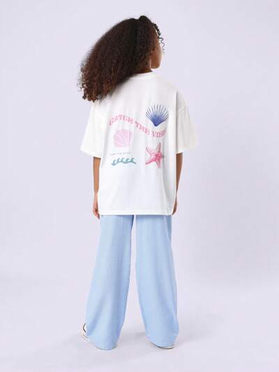 Oversized Mädchen Tween Muschel Muster Grafik T-Shirt und gestreifte weite Hose Strand Resort Urlaub Sommer Outfit Set
