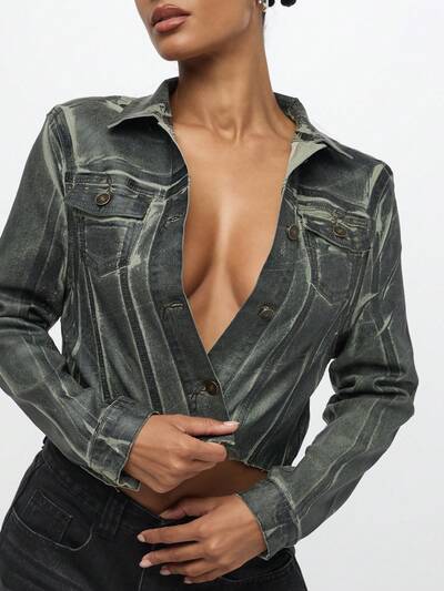 SUMWON WOMEN Trucker-Jeansjacke im Used-Look mit WachsbeschichtungBABYPHAT Oversize Jeans-Shacket Jacke für Frauen - Lässige Reißverschluss Utility Oberbekleidung mit Taschen Herbst Winter