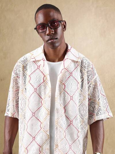 Retro Häkel-Freizeithemd mit Wabenmuster und Button-Down-Kragen-45%