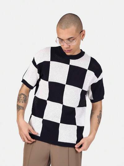 Camiseta de manga corta de punto con estampado de cuadros de crochet-35%