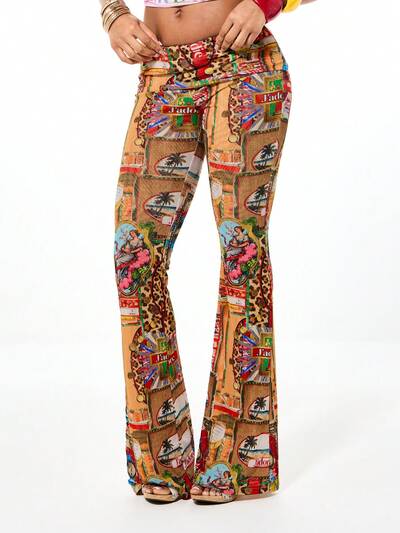 SUMWON WOMEN Pantalones acampanados de tiro bajo con malla estampada y estampado mixto