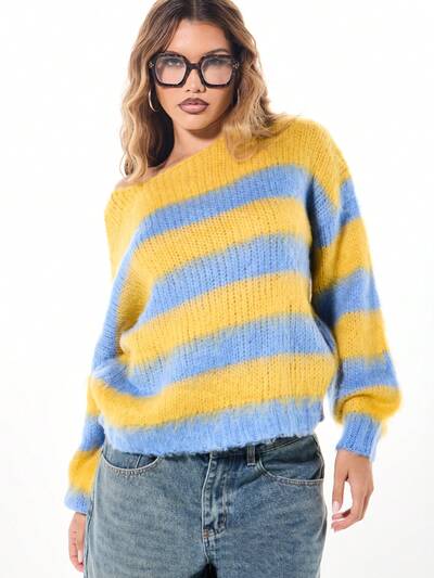 SUMWON WOMEN Suéter de punto a rayas con hombros descubiertos y diseño de números-35%