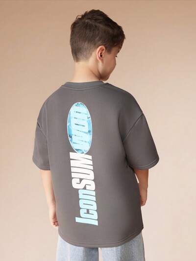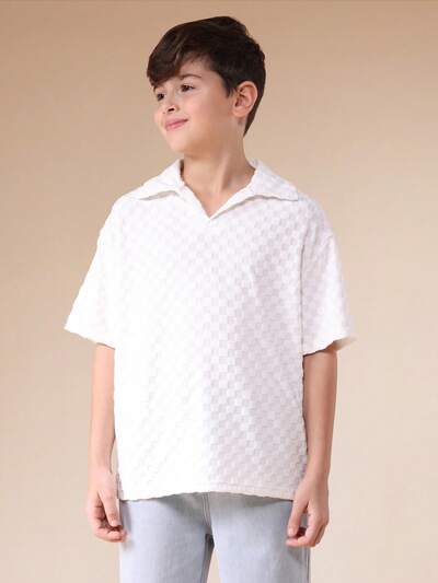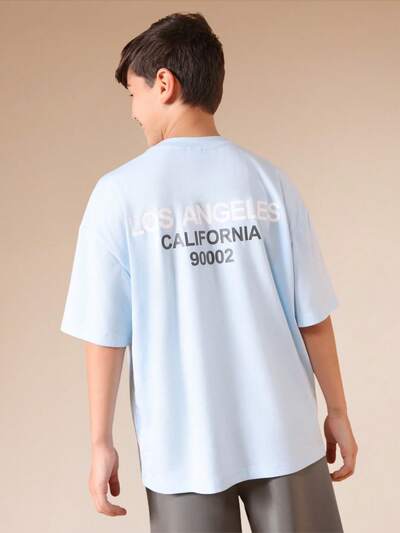 Camiseta de cuello redondo de manga corta color azul claro para niños preadolescentes con panel frontal de textura acanalada y pequeño detalle de logo de marca