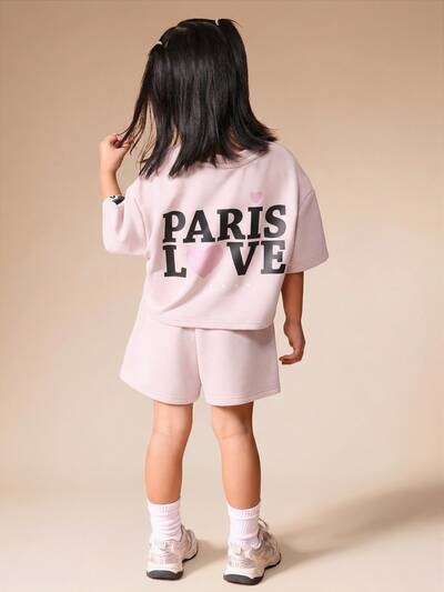 Ensemble deux pièces graphique Paris Love pour jeunes filles. Tenue d'été décontractée avec crop top et short